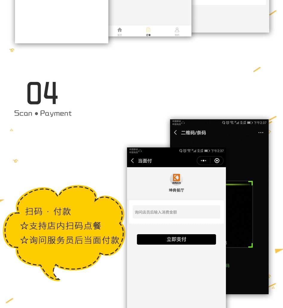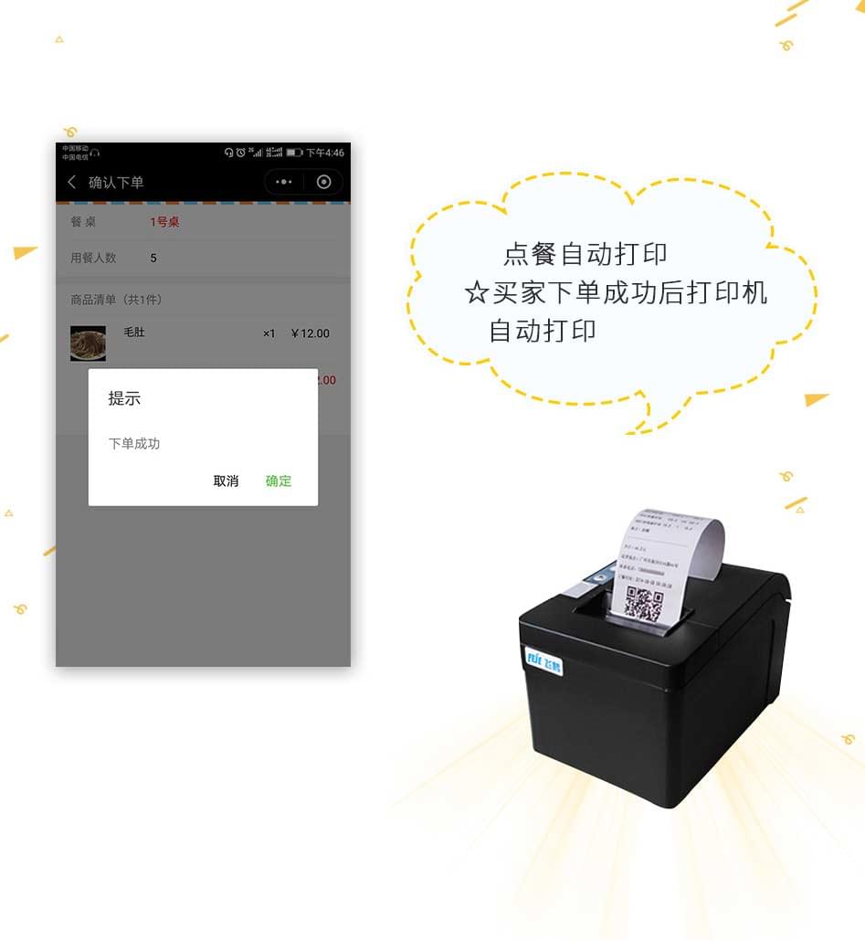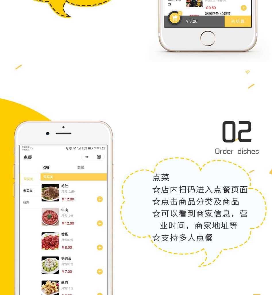 单店外卖、多店营销、商家展示、商家定位、订单提醒、模板消息、扫码点餐、预约桌位、预定菜品、扫码付款、在线点餐、分销系统、排队取号、支付收银、商家入驻、打印机支持、会员卡、优惠券功能、报表统计、积分商城、余额充值、店铺评论